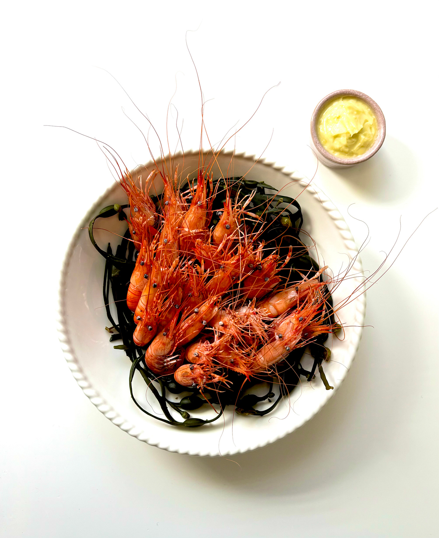 If using the bladderwrack grab a handful into a bowl and arrange the shrimp on top, serve with the aioli.